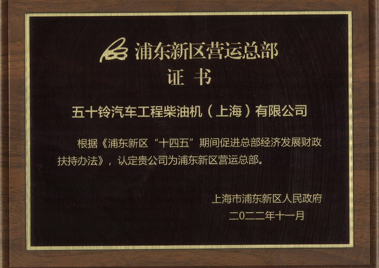 經(jīng)過層層考核和篩選,五十鈴汽車工程柴油機(上海)有限公司有幸在本次大會中被認(rèn)定為浦東新區(qū)營運總部。這無疑是浦東新區(qū)政府對五十鈴的高度信任和認(rèn)可的體現(xiàn)。我司總經(jīng)理安平英明當(dāng)日參加頒獎儀式,代表我司取得了認(rèn)定證書。